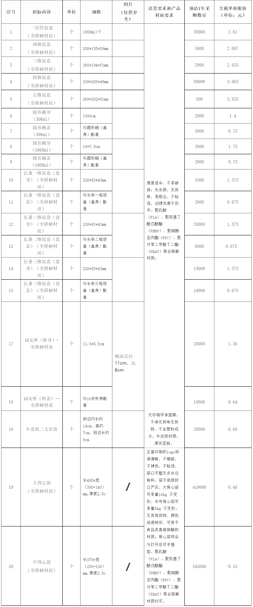 1.5招标内容、数量、限价或预算:本项目拟通过公开招标方式选取1名供应商,负责为广州南联航空食品有限公司提供可降解餐具及食品袋采购项目。该项目预算金额约为90.5万/年,合同期限为1年。(产品清单详见下表)