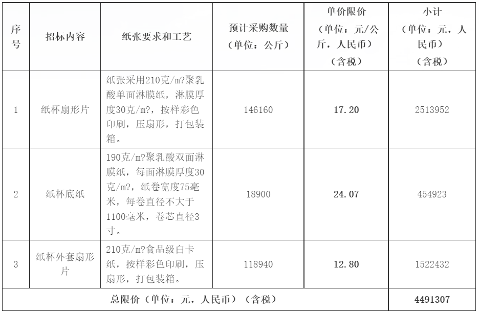 通过公开招标方式选取一名中标供应商提供一次性纸杯原材料供货服务。