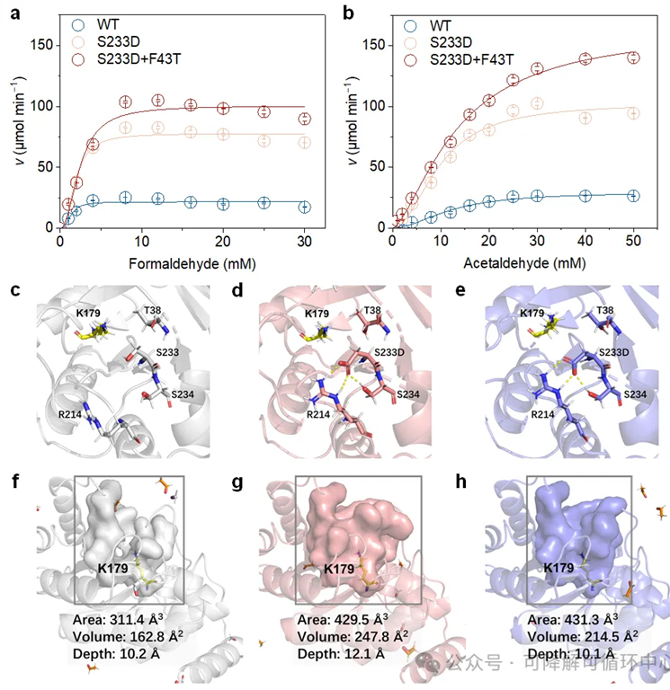 图: 醛缩酶野生型和突变体表征。(a) 甲醛和 (b) 乙醛的酶活性测定。(c) WT、(d) S233D 和(e) S233D/F43T 突变区域的相互作用分析。(f) WT、(g) S233D 和 (h) S233D/F43T 结合口袋的表面结构图。