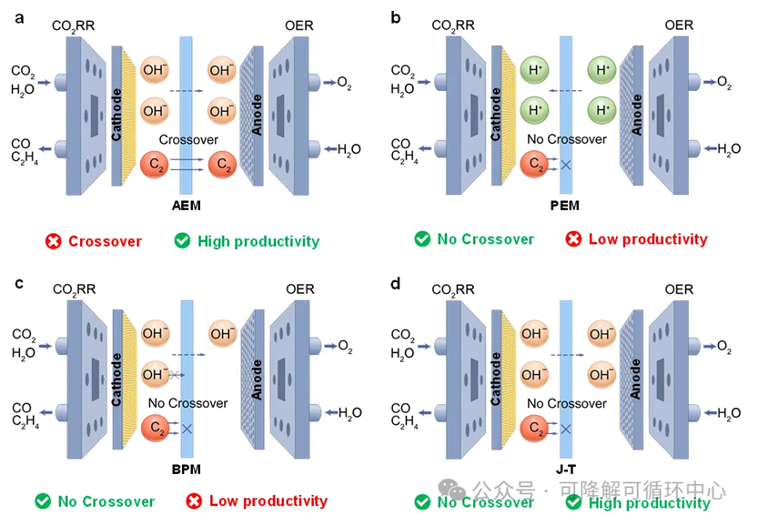 图:使用不同膜的CO2电化学还原(CO2RR)过程示意图。a, 阴离子交换膜;b,质子交换膜;c,双极膜;d, J-T膜(本工作)。