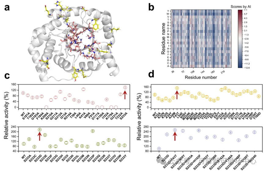 图: AI辅助酶工程 a,通过理性设计确定的活性中心口袋内关键氨基酸(粉色)与AI预测残基位点(黄色)在DERA结构中的空间分布。b,AI生成评分的热力图可视化。c,活性中心丙氨酸扫描结果及S233位点饱和突变变体的相对活性。d,AI预测的实验验证及S233D与AI识别优势突变的组合效应分析。