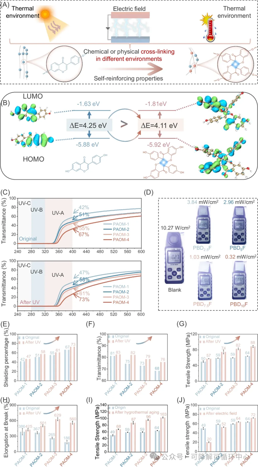 图5 | PAOM的自增强行为。 A PAOM的自增强机制示意图。 B 通过密度泛函理论计算得到的DDF和光交联体系的优化分子几何结构及HOMO-LUMO能级。 C UV照射前后PAOM薄膜的紫外透射率(厚度:0.3 mm)。 D PAOM在紫外灯下的抗紫外线测试。 E, F 原始和UV照射后薄膜在400 nm处的屏蔽效率和750 nm处的透射率。 G, H 原始和UV照射后PAOM薄膜的拉伸强度和断裂伸长率。柱状图代表三次独立实验的平均值,误差棒为基于三次独立实验的标准差。 I, J PAOM薄膜及其在经过湿热老化和电场处理后的拉伸强度。柱状图代表三次独立实验的平均值,误差棒为基于三次独立实验的标准差。