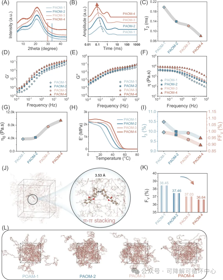 图2 | PAOM的结构表征。 A PAOM的X射线衍射图谱。 B, C PAOM的低场核磁共振曲线和横向弛豫时间分布曲线,图中阴影区域表示参数随掺入量增加的变化趋势。 D–G PAOM的储能模量、损耗模量、复数粘度和零剪切粘度随频率变化的曲线,图中阴影区域表示参数随掺入量增加的变化趋势。 H 聚合物的储能模量随温度变化的曲线。 I PAOM的正电子湮没寿命分析。 J–L 分子动力学模拟揭示了材料内部的π-π堆叠、自由体积分数和分子链模型。