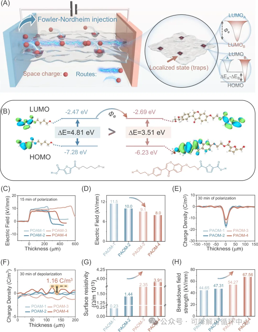 图4 | PAOM的绝缘性能。 A 绝缘机制示意图。 B 不同结构单元的分子轨道能级。 C, D 空间电荷测试中极化15分钟后PAOM内部的电场强度分布和最大电场强度。 E 极化30分钟后PAOM表面的电荷密度。 F 去极化30分钟后PAOM内部的电荷密度。 G, H PAOM的表面电阻率和击穿场强。