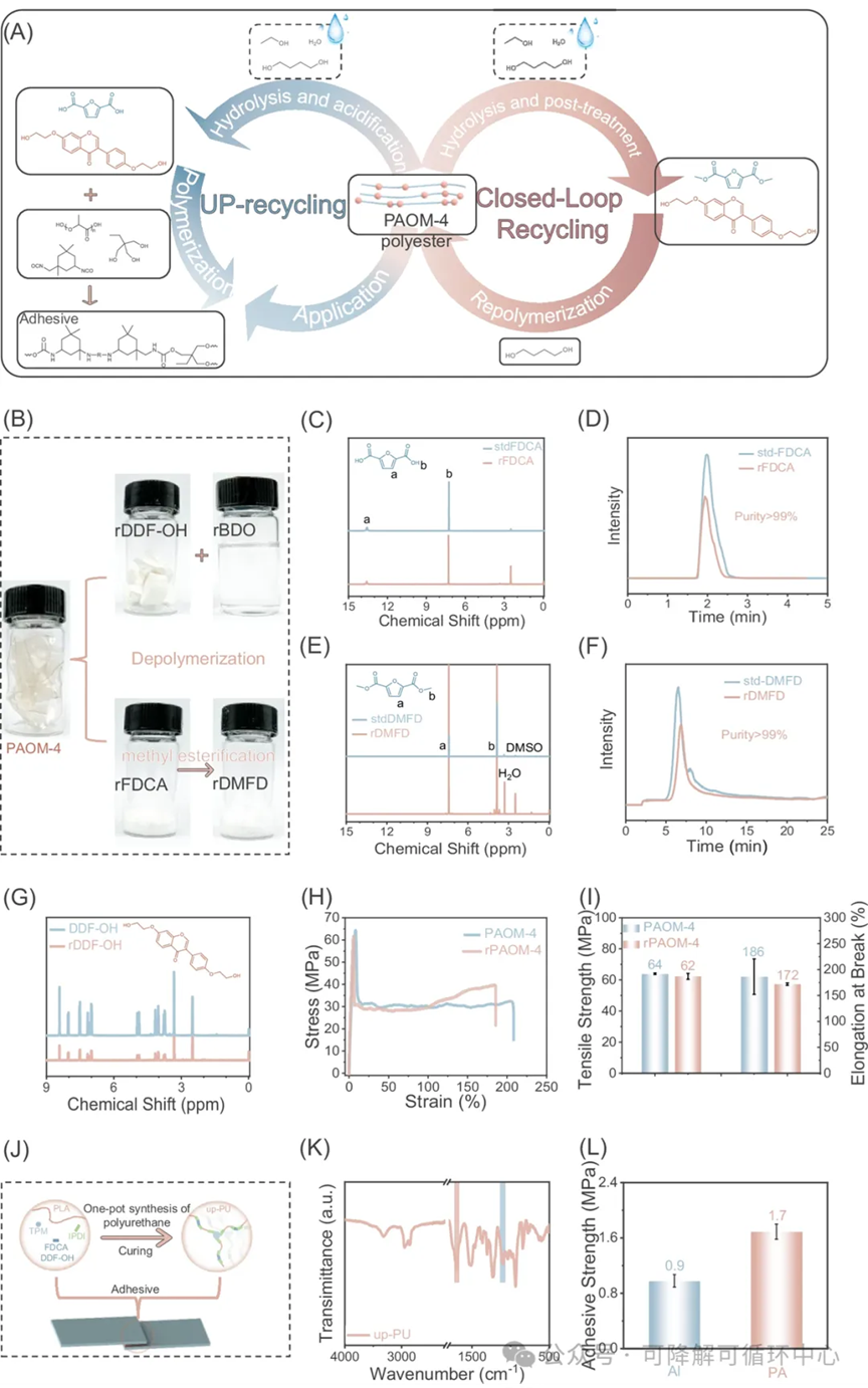 图6 | PAOM的化学回收。 A PAOM回收过程示意图。 B PAOM-4在H₂O/BDO/NaOH体系中解聚得到的回收单体rDDF-OH、rBDO、rFDCA和rDMFD的实物照片。 C–F 回收实验中得到的FDCA/rFDCA和DMFD/rDMFD在DMSO-d6中的核磁共振氢谱和液相色谱分析。 G rDDF-OH在DMSO-d6中的核磁共振氢谱。 H, I PAOM-4和rPAOM-4的应力-应变曲线、拉伸强度和断裂伸长率。柱状图代表三次独立实验的平均值,误差棒为基于三次独立实验的标准差。 J up-PU的合成过程及其作为粘合剂的应用示意图。 K up-PU的傅里叶变换红外光谱。 L up-PU在铝板和聚酰胺板上的粘合强度。柱状图代表三次独立实验的平均值,误差棒为基于三次独立实验的标准差。