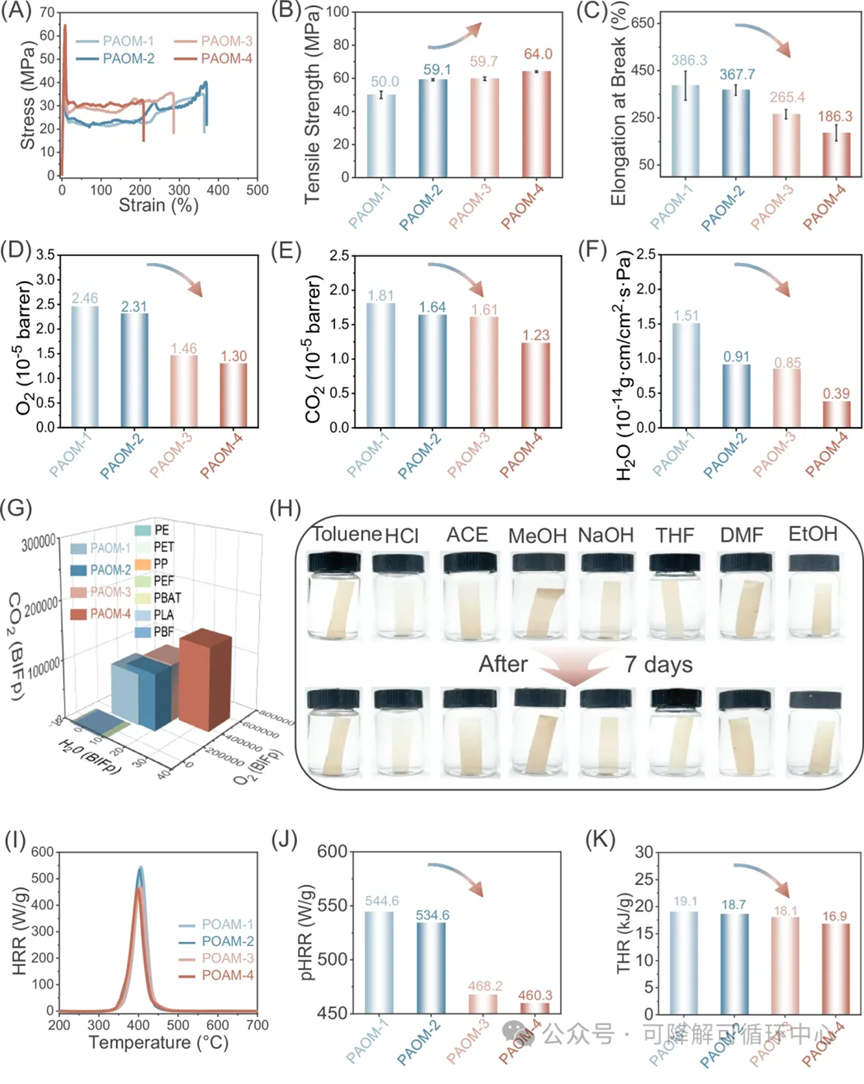 这种独特的结构赋予了PAOM材料卓越的多功能性。研究表明,PAOM兼具良好的结晶性、耐热性、机械强度、阻隔性能、耐溶剂性和阻燃性。其气体阻隔性能(对CO₂、O₂和H₂O)优于许多生物基和工程塑料,并且在不同有机溶剂中浸泡七天后仍能保持形状和重量。同时,其热释放速率和总热释放量显著降低,显示出优异的阻燃特性。