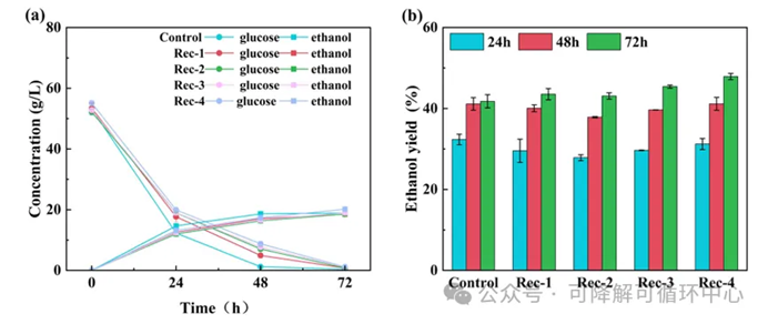 图3. 酿酒酵母BY4742的乙醇生物发酵过程。分别对预处理玉米秸秆进行水解和发酵所得的浓度(a)与乙醇产率(b)。