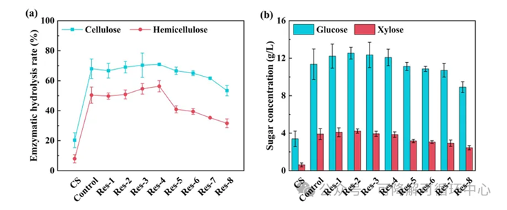 图2. 玉米秸秆(CS)、预处理玉米秸秆(对照组)及经ABL循环处理1至8次的预处理玉米秸秆(Rec 1–8)的酶水解效率(a)与糖浓度(b)对比。