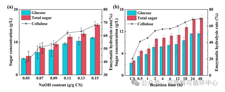 图1. 酶水解对不同预处理条件下玉米秸秆(CS)的影响。预处理过程中氢氧化钠含量(a)与反应时间(b)。