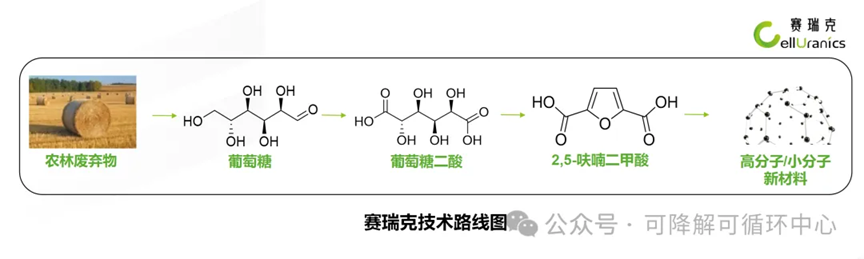 赛瑞克致力于两个生物基平台化合物葡萄糖二酸和2,5-呋喃二甲酸(FDCA)及其衍生物的研发和产业化,已成功开发具有自主知识产权并且国际领先的非粮葡萄糖到葡萄糖二酸(GA)到FDCA的合成路线、生产工艺和纯化方法。