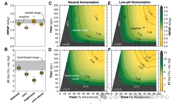 结论:不同原料路径的MPSP和CI分布显示,玉米秸秆基生物制造在低pH发酵条件下可能具有最佳经济与环境效益,但其产量-滴度组合需进一步优化以匹配化石基丙烯酸的竞争力。