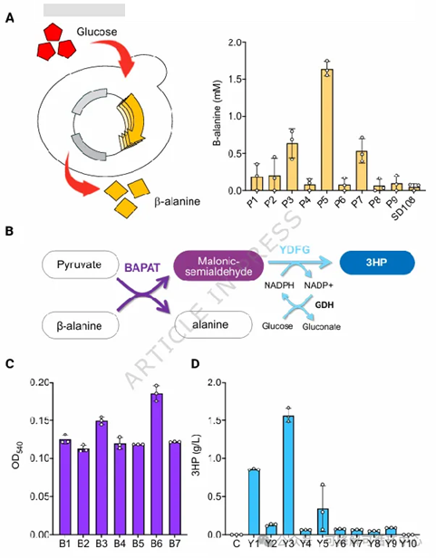 图2 | 用于3HP生产的β-丙氨酸途径中新途径基因的发现与表征。A. 作者在过表达PAND候选基因的菌株中检测了β-丙氨酸的积累情况。结果显示,过表达这些基因导致了β-丙氨酸的积累,表明这些基因参与了β-丙氨酸的代谢途径。B. 作者对BAPAT和YDFG基因进行了体外酶活测定。该实验旨在验证这些基因编码的蛋白质是否具有预期的催化活性。C. 作者通过测量OD540来定量体外BAPAT酶活测定的结果。该数据反映了BAPAT酶的活性水平。D. 作者通过测量3HP的产量来定量体外YDFG酶活测定的结果。该数据直接反映了YDFG酶将底物转化为3HP的催化效率。