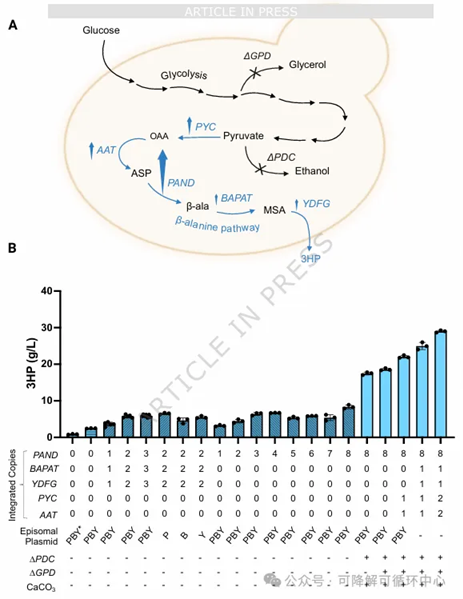 赵惠民教授表示:“据我们所知,这项研究在所有工程化细菌和酵母宿主中实现了3-HP生产的最高产量和滴度。”