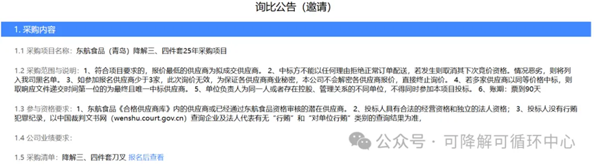 11月4日,东航食品(青岛)降解三、四件套25年采购项目询价公告发布。