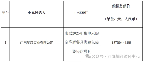 11月5日,南联2025年集中采购全降解餐具类和包装袋采购项目评标公示发布。