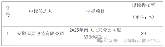 11月12日,2025年南联北京分公司胶袋采购项目评标公示。