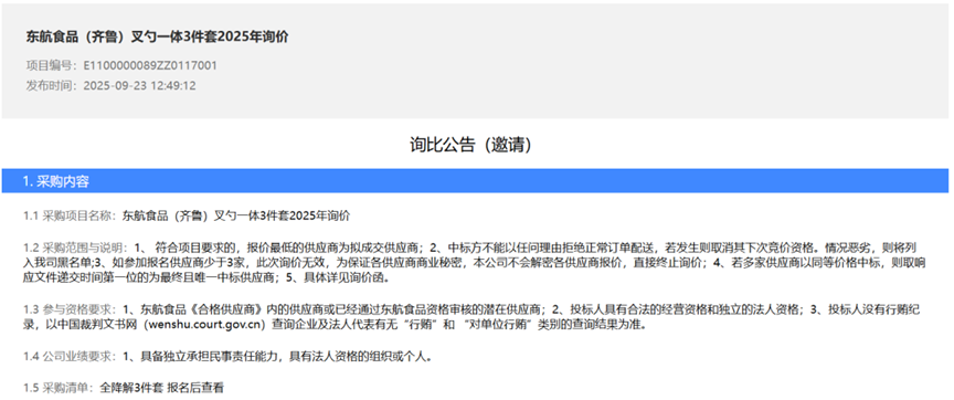9月23日,东航食品(齐鲁)叉勺一体3件套2025年询价公告发布。