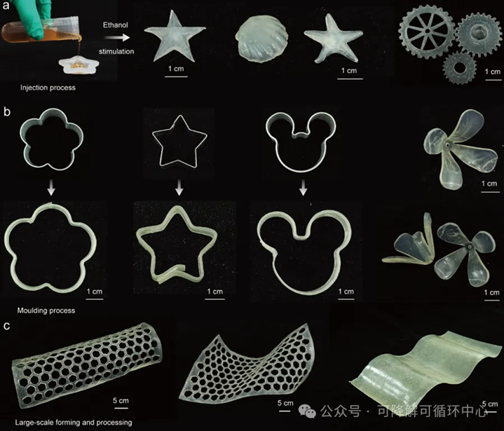 可扩展的熔融加工,包括挤出、注射和成型技术,是石化塑料成型的主要工业方法。相比于已报道的生物基塑料工艺,我们的竹纤维分子体系具有液态流动性,可以使用与商业塑料相似的熔融、注射、挤出加工技术进行成型设计,只需通过简单的乙醇溶液刺激,即可轻松地将BM-plastic制造成任何可定制的3D形状,如星星、贝壳、海星和齿轮(图5)。光学特性表明,在控制厚度为0.15 mm时,BM-plastic的雾度值为10.12%,光透过率高达90.32%,这表明其在需要透明度和平衡光扩散的应用中具有吸引人的潜力。此外,这种竹分子成型策略还可以扩展至其他溶剂,如乙腈、丙酮、四氢呋喃。该过程不需要高温或高压,充分利用了丰富的竹子原料,这使得BM-plastic有望成为传统塑料的可扩展替代品。这种加工优势符合绿色制造的原则,通过减少能耗和降低环境足迹来实现可持续发展。