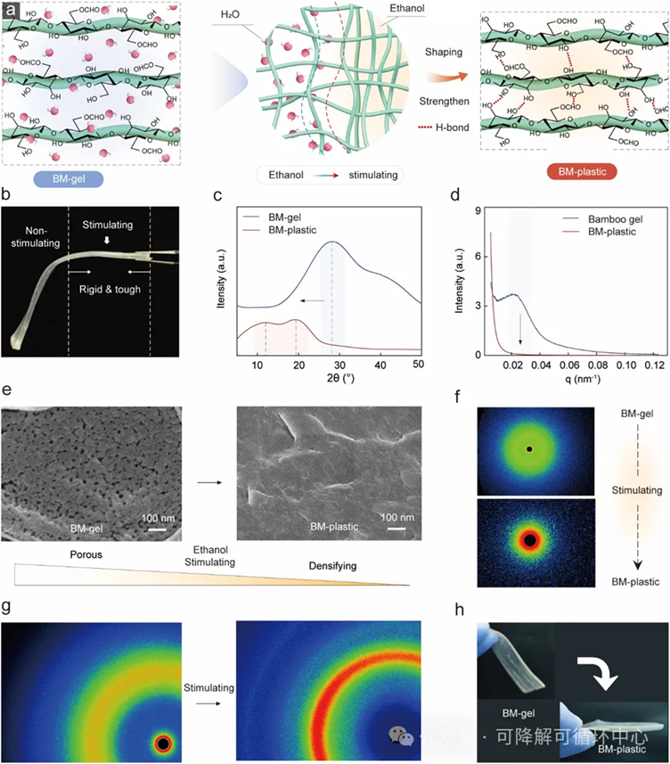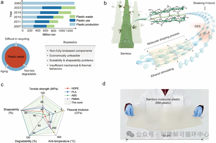 全球每年超亿吨的塑料产量与日益严峻的白色污染影响下,开发兼具高机械性能、可塑型、全降解及可循环再利用的生物基塑料是解决当下石化塑料污染物问题的有效途径。近日,东北林业大学于海鹏教授与沈阳化工大学赵大伟教授,提出一种绿色溶剂调控的分子重塑技术,精准调控竹纤维素分子网络中氢键“重组”,开发了一种竹分子塑料(BM-plastic)。该生物塑料不仅力学强度超越多数通用工程塑料,同时展示出优异的热稳定性、可控塑型性、循环再利用性及完全的自然环境可降解性,为从源头破解塑料污染困境提供了可行方案。相关成果以“High-strength, multi-mode processable bamboo molecular bioplastic enabled by solvent-shaping regulation”为题发表于Nature Communications期刊。