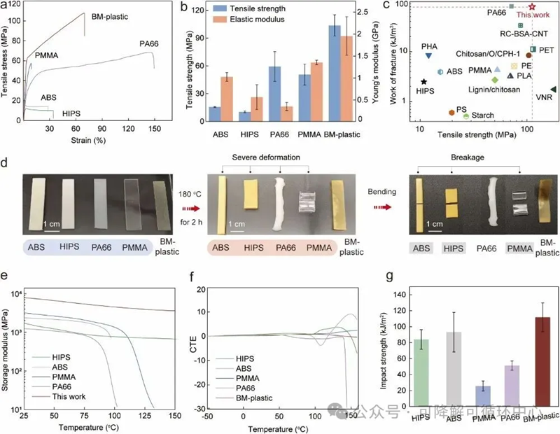 图4BM-plastic与商用塑料的力学和热性能比较