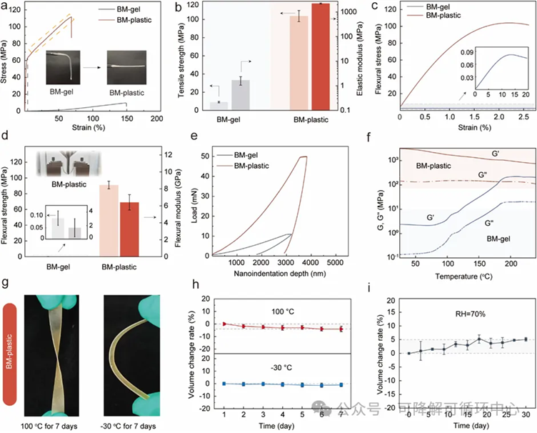 通过对BM-plastic进行全面的机械力学性能评估,包括拉伸强度、弯曲强度、韧性和硬度。如图3所示,BM-plastic的极限拉伸强度达到110 MPa,弹性模量可达2.2 GPa。在弯曲测试中,BM-plastic同样表现出强悍的抗变形能力,弯曲强度达到92 MPa时仍能保持出色的塑性变形,表明BM-plastic在承受大弯曲时,展示出吸引人的韧性特性。这种卓越的机械特性归因于BM-plastic中增强的氢键网络结构。相比于石化塑料,BM-plastic还展示出更优越的热-机械性能,即使在高达100 °C及-40 °C环境下暴露7天,BM-plastic依然展示出高的机械力学强度与韧性。在机械性能方面的突出表现使得BM-plastic成为家用产品、汽车零部件和公共设施等领域应用的有力候选材料。