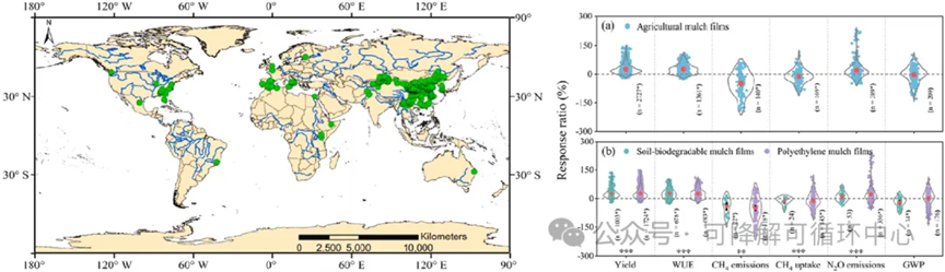 该研究通过对724篇出版物中的4331个实验数据集进行全球Meta分析,系统比较了BDM与PM在作物产量、水分利用效率(WUE)及温室气体排放方面的差异。系统评估了生物降解地膜相较传统聚乙烯地膜的可持续性协同效应,研究表明: