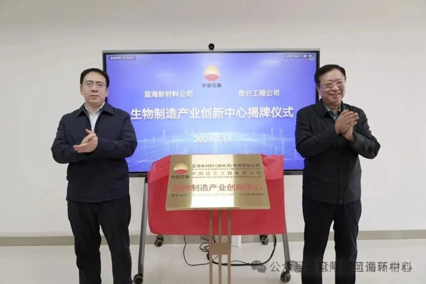 1月18日,中石油蓝海新材料公司与中国昆仑工程公司合作成立的“生物制造产业创新中心”在通州湾揭牌,蓝海新材料公司执行董事、党委书记李贵合,中国昆仑工程公司执行董事、党委书记李利军出席活动并讲话。