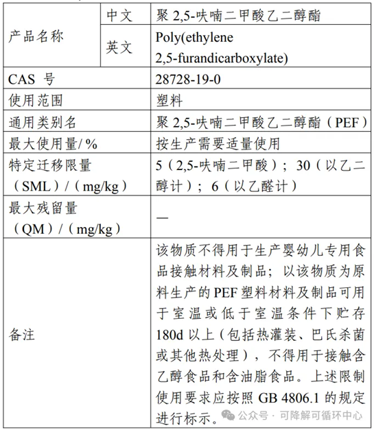 该物质为塑料材料及制品的基础树脂,具有较好的气体阻隔性、机械性能和耐温变形性能。经安全性评估,以该物质为原料生产的塑料材料及制品在室温或低于室温条件下贮存180d以上(包括热灌装、巴氏杀菌或其他热处理)、不接触含油脂食品(食品表面含游离脂肪的食品)和含乙醇食品(乙醇含量超过10%的食品)的情形下可安全使用。鉴于聚2,5-呋喃二甲酸乙二醇酯用于婴幼儿人群的安全性资料不足,从风险预防原则考虑,限制该类材料用于生产婴幼儿专用食品接触材料及制品。其他使用要求按照公告规定执行。美国食品药品管理局、欧盟委员会和南方共同市场均允许该物质用于食品接触用塑料材料及制品。