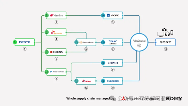 ① 生产可再生石脑油 ——Neste公司; ② 生产可再生苯乙烯单体 —— 出光兴产公司; ③ 生产可再生聚苯乙烯树脂 —— 台湾化学纤维股份有限公司; ④ 生产可再生对二甲苯 —— SK Geo Centric 公司; ⑤ 生产可再生对二甲苯 —— ENEOS公司; ⑥ 生产可再生精对苯二甲酸 —— 韩华 Impact 公司; ⑦ 生产可再生PET树脂 —— 东丽尖端材料韩国公司; ⑧ 生产可再生双酚A —— 三井化学公司; ⑨ 生产可再生聚碳酸酯 (PC) 树脂 —— 奇美实业股份有限公司; ⑩ 生产可再生阻燃剂 —— 艾迪科公司; ⑪ 生产可再生PC/ABS树脂 —— 青岛海尔新材料研发有限公司; ⑫ 模具制造商; ⑬ 成品设计与制造 —— 索尼公司