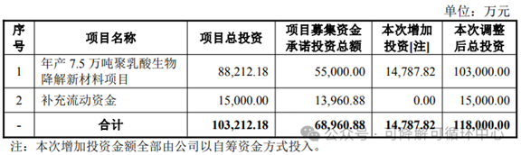 公司拟通过使用自筹资金对年产7.5万吨聚乳酸生物降解新材料项目增加投资14,787.82万元,增加投资后,本项目预计投资总额为103,000.00万元。