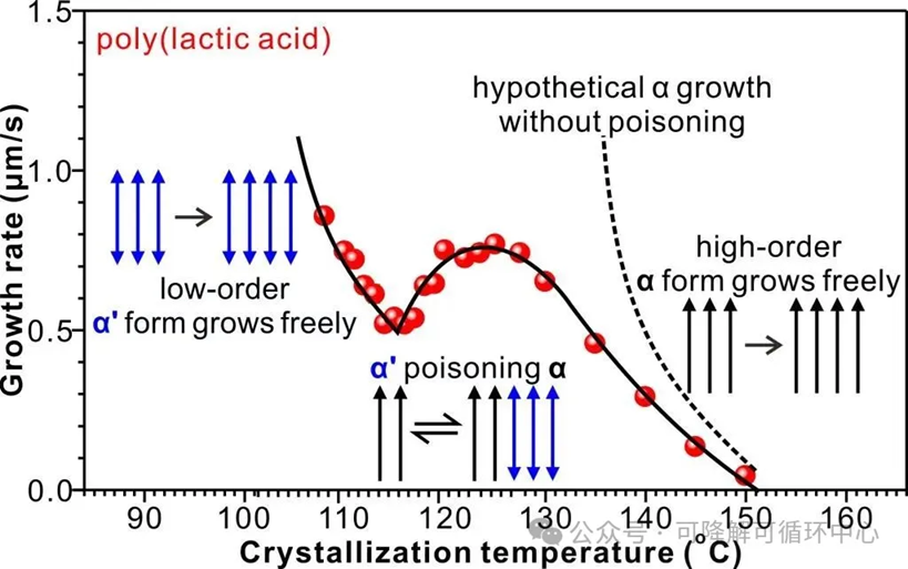 图1. 聚乳酸球晶生长速率-结晶温度曲线,以及多晶相自中毒机制的示意图