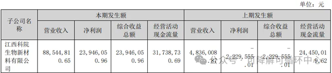 控股子公司江西科院生物新材料有限公司主营业务为乳酸、聚合乳酸及其衍生关联产品的生产、销售,2025年营收8854.48万元,净利润2394.6万元。