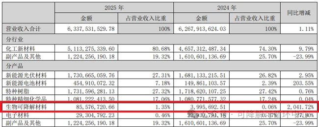 联泓新科是一家新材料产品和解决方案供应商,主要从事新能源材料、生物材料、电子材料、特种材料等新材料的研发、生产和销售。其中,生物材料作为重要发展方向,已投资布局 PLA、PPC 等全生物可降解材料。2025年,生物可降解材料营收85,576,720.66元,同比增长2041.72%,占营业比重1.35%。