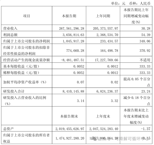 归母净利润为104.59万元,同比增长348.06%;扣非净利润77.47万元,同比增长370.92%。