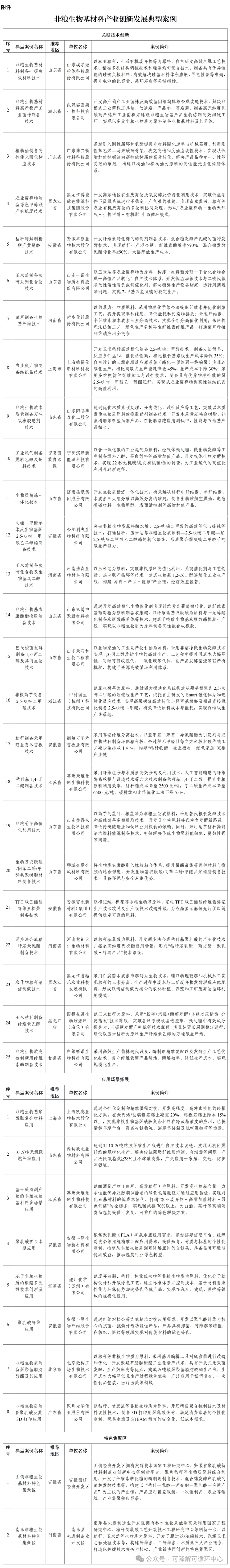 《非粮生物基材料产业创新发展典型案例》包括25项关键技术创新,8大应用场景,2个特色产业集聚区(安徽固镇经济开发区、南乐县先进制造业开发区)。