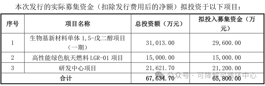 公司本次发行股票募集资金计划投资于以下项目:生物基新材料单体 1,5-戊二醇项目(一期)、高性能绿色航天燃料 LGR-01 项目、研发中心项目。