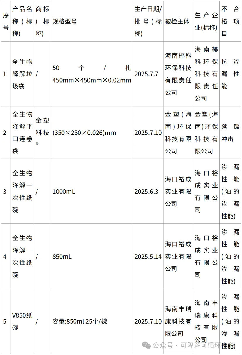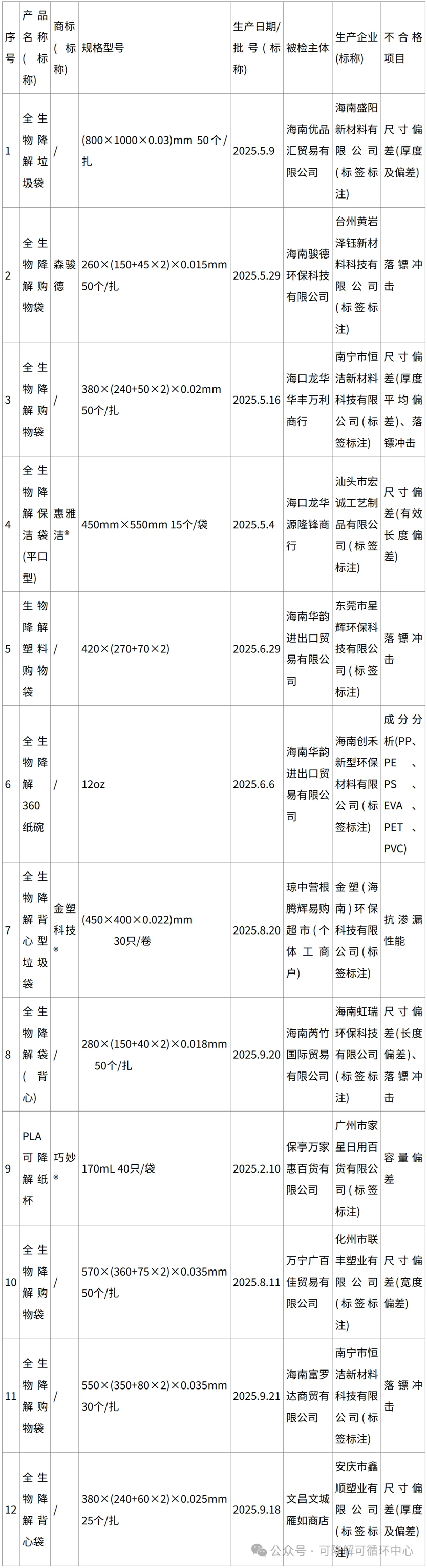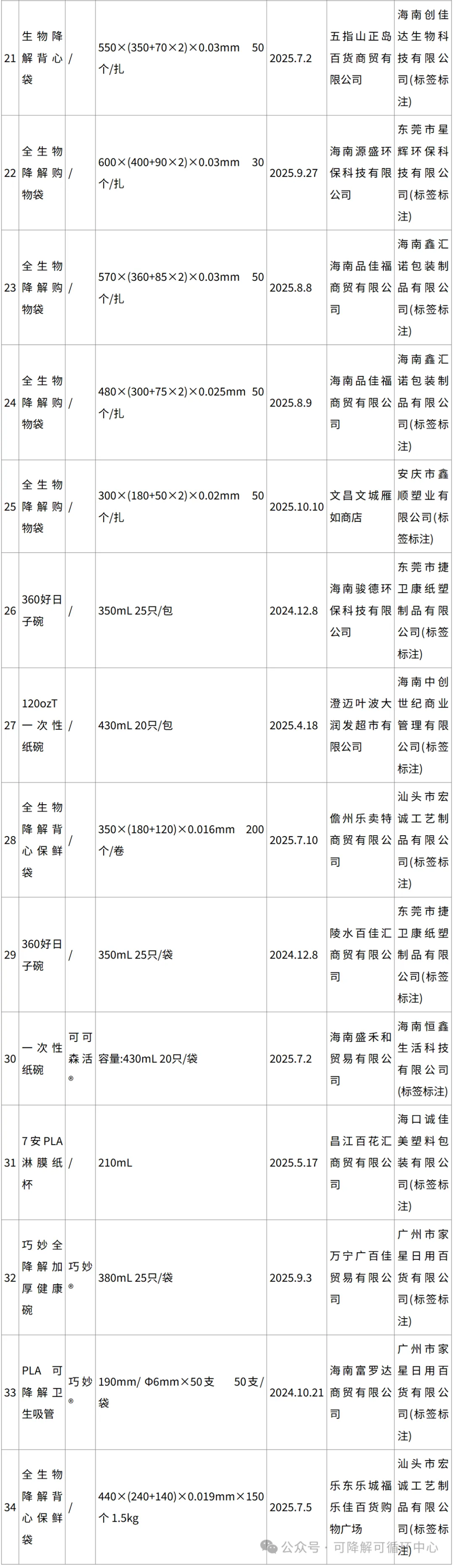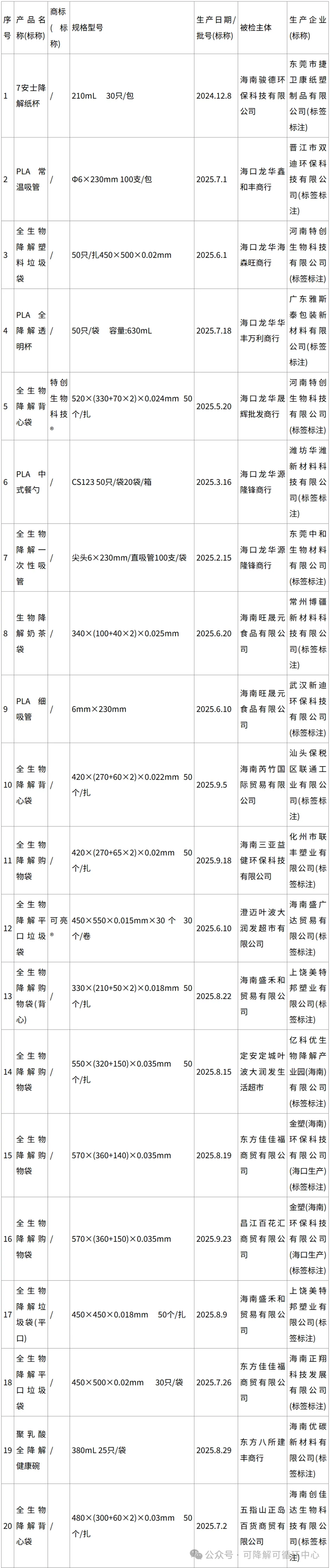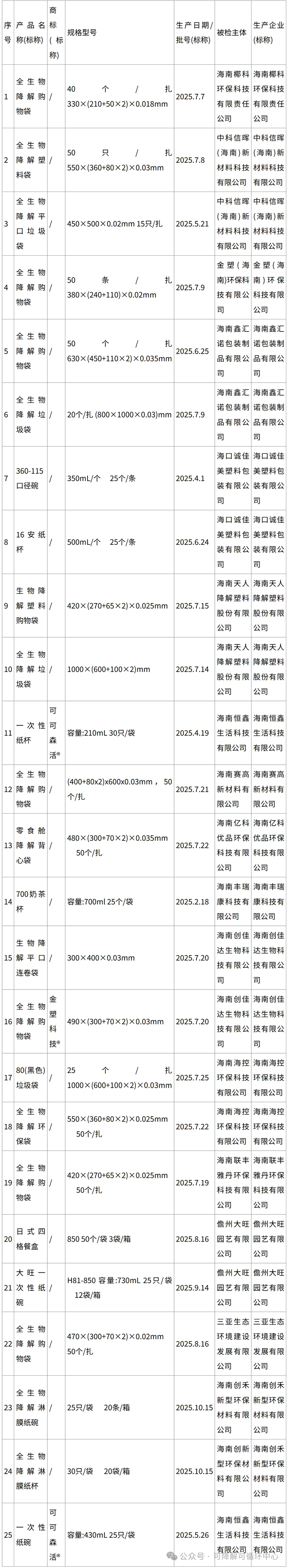 3月26日,2025年海南省生产、流通领域全生物降解塑料制品产品质量监督抽查结果公布。